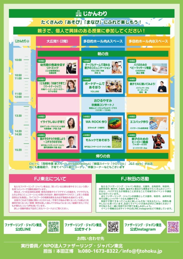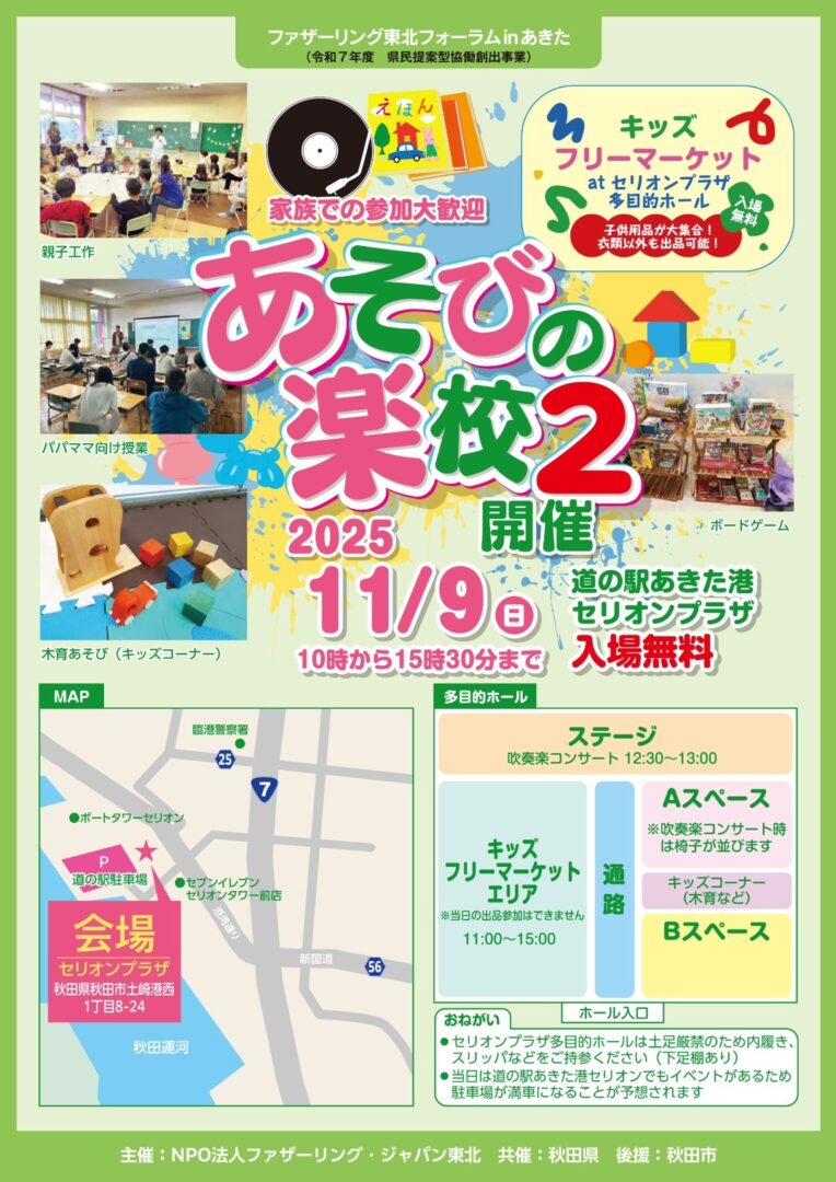 秋田県って子育てするのにとってもいい場所だと思っています。食べ物もおいしいし、自然も多いし、なにより人が暖かい。川や湖や海も近いし冬には雪遊びもできる。このイベントをきっかけに改めて子どもへの関わり、親子のコミュニケーションついて感じてほしいですね。いろいろな学び、遊びの機会が揃った「あそびの楽校」でみなさんをお待ちしてます!