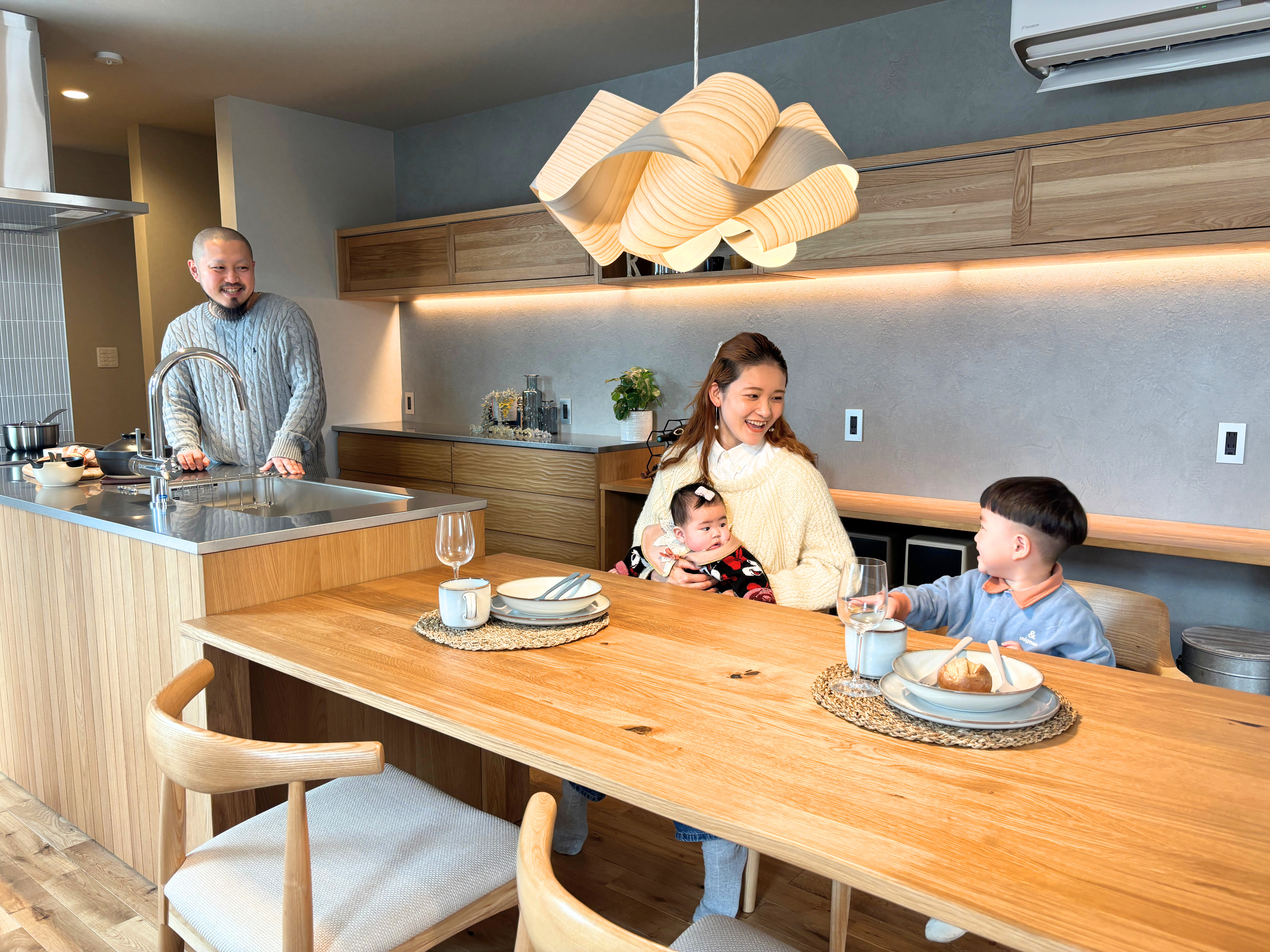 キッチンとダイニングテーブルが一列に配置されているので、料理をしながらでも子どもと自然に会話ができるのがうれしいポイント♡宿題やお絵描きを見守ることもできて、家族との時間がしっかり取れます。