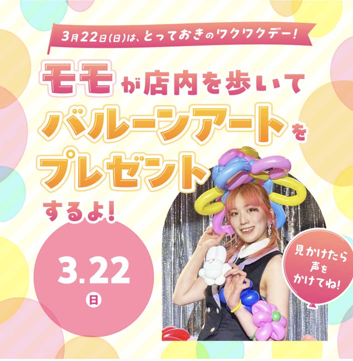バルーンアーティストモモが店内を歩きながら、みなさまに会いにやってきます。そしてその場で、ひとつひとつ心を込めて作る バルーンアートをプレゼント!「何ができるのかな?」と待つ時間も楽しい、特別なひとときです!