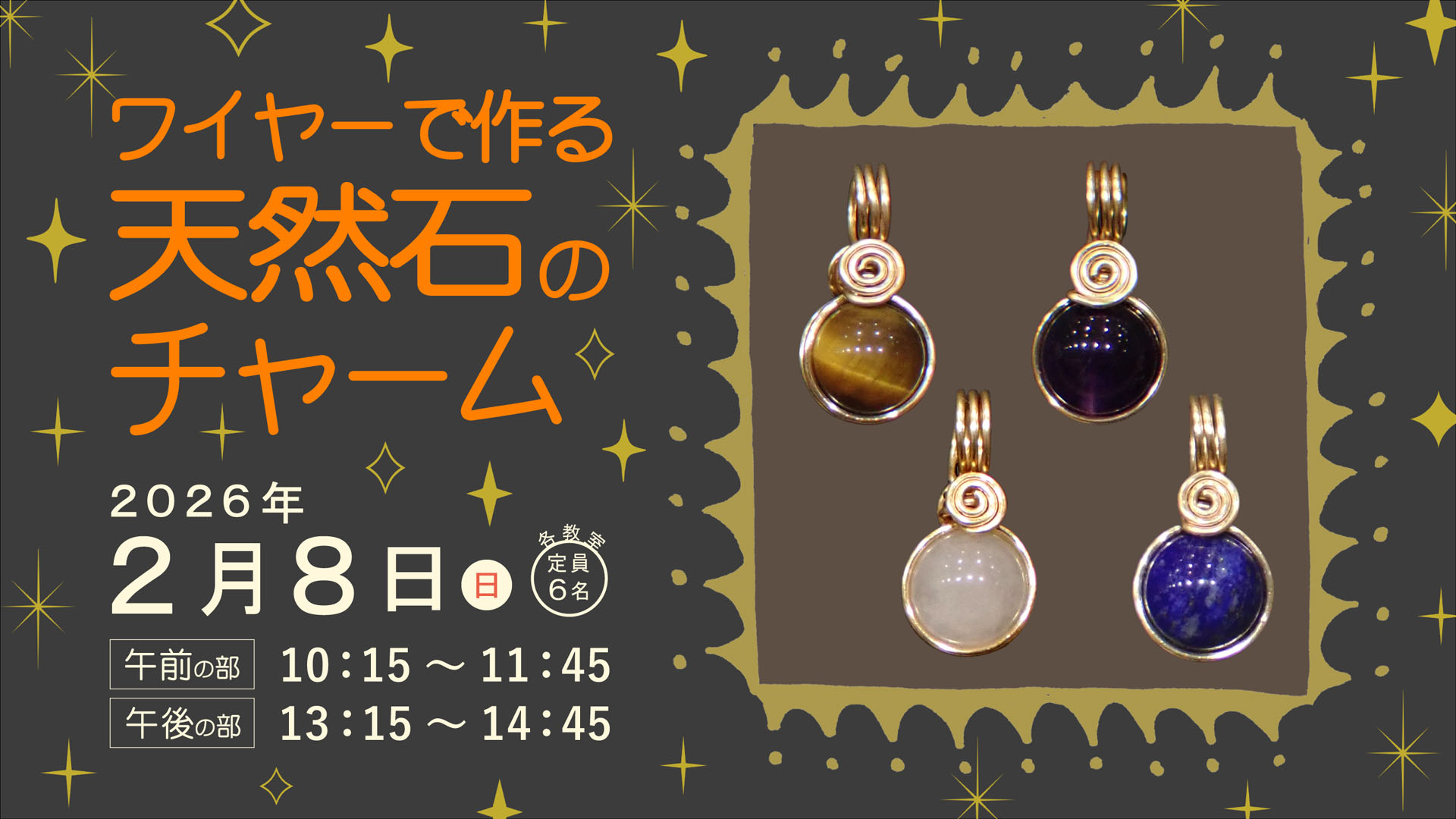 天然石の丸玉ビーズをワイヤーで包み、チャームを作ります。ネックレスにつけたりキーホルダーにつけたり、お好きな使い方で鉱物に親しんでください!