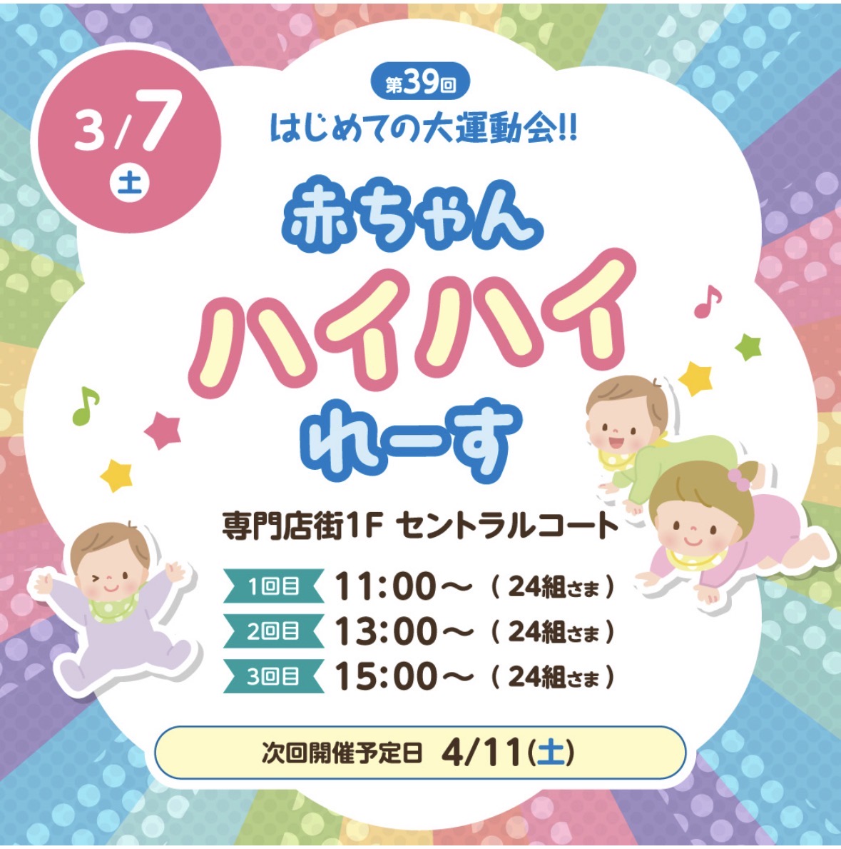 第39回 はじめての大運動会!!赤ちゃんハイハイれーす1レース最大3人の赤ちゃんが約5mのコースでレースを行います。お子さまがハイハイしている今しか参加できません!ご家族そろってお楽しみいただける、心あたたまるイベントです。ぜひご参加ください♪♪